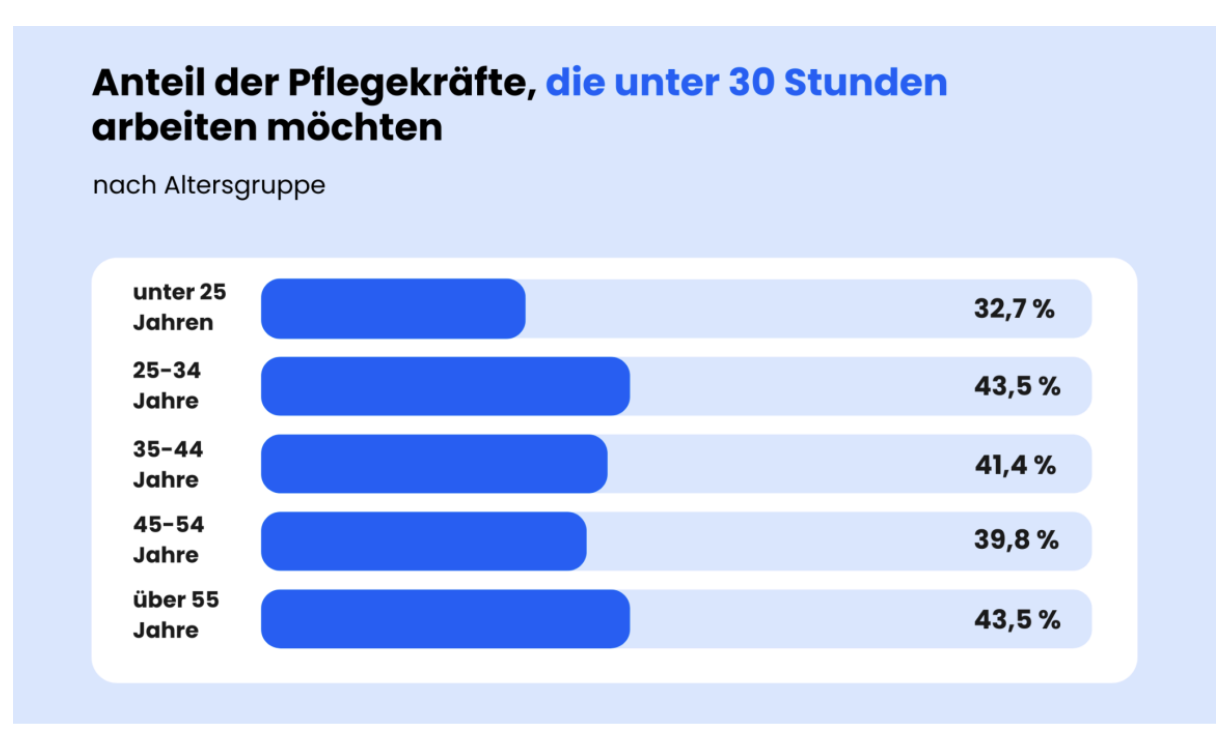 Entgegen gängigen Erwartungen sind nicht die jüngsten Pflegekräfte am stärksten teilzeitorientiert. Während nur 32,7 % der unter 25-Jährigen, also Gen Z, weniger als 30 Stunden arbeiten möchten, liegen die Werte bei allen höheren Altersgruppen darüber. Auch die Gruppen 35-44 Jahre (41,4 %) und 45-54 Jahre (39,8 %) zeigen vergleichsweise hohe Teilzeitwünsche.
